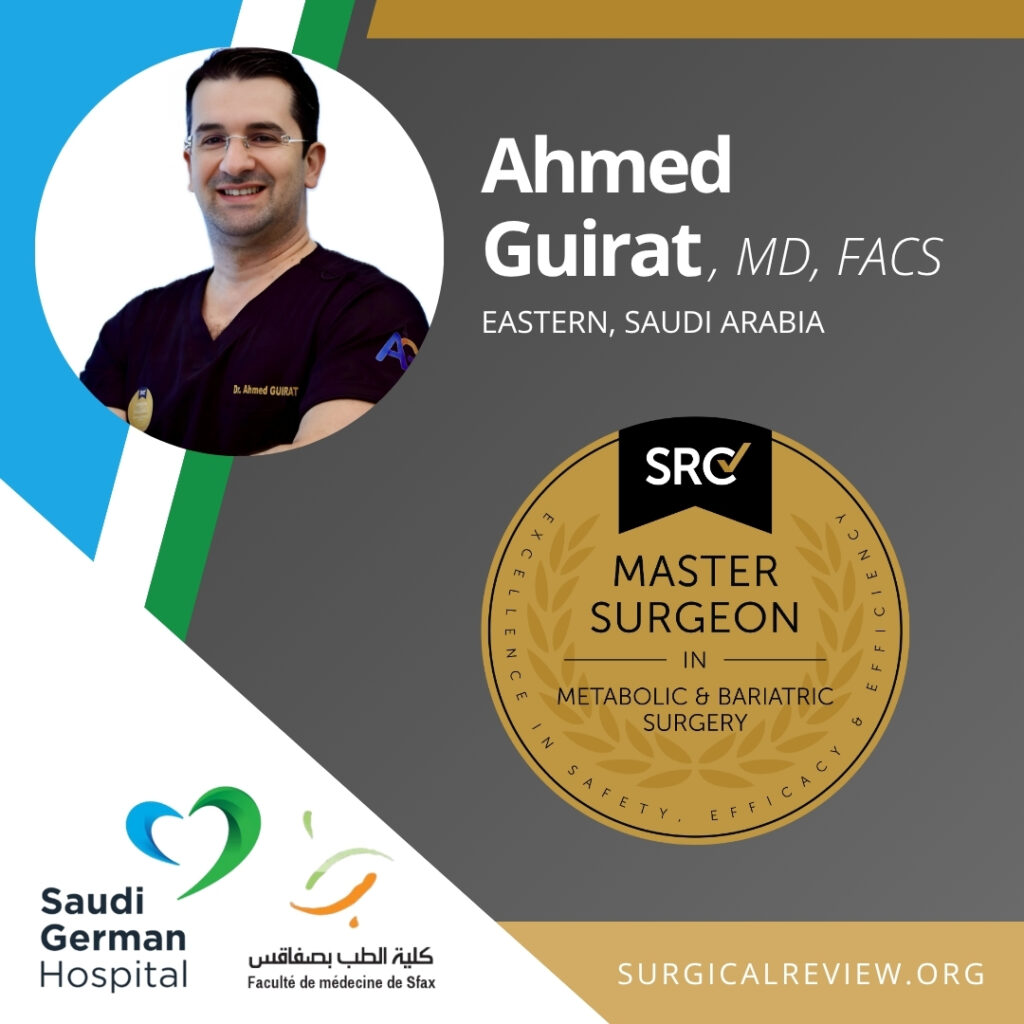 Ahmed Guirat, MD, FACS has been accredited as an SRC Master Surgeon in Metabolic and Bariatric Surgery. Dr. Guirat is the Consultant of Bariatric and Metabolic Surgery at Saudi German Hospital Dammam in Eastern, Saudi Arabia and teaches at University of Medicine Sfax, Tunisia.