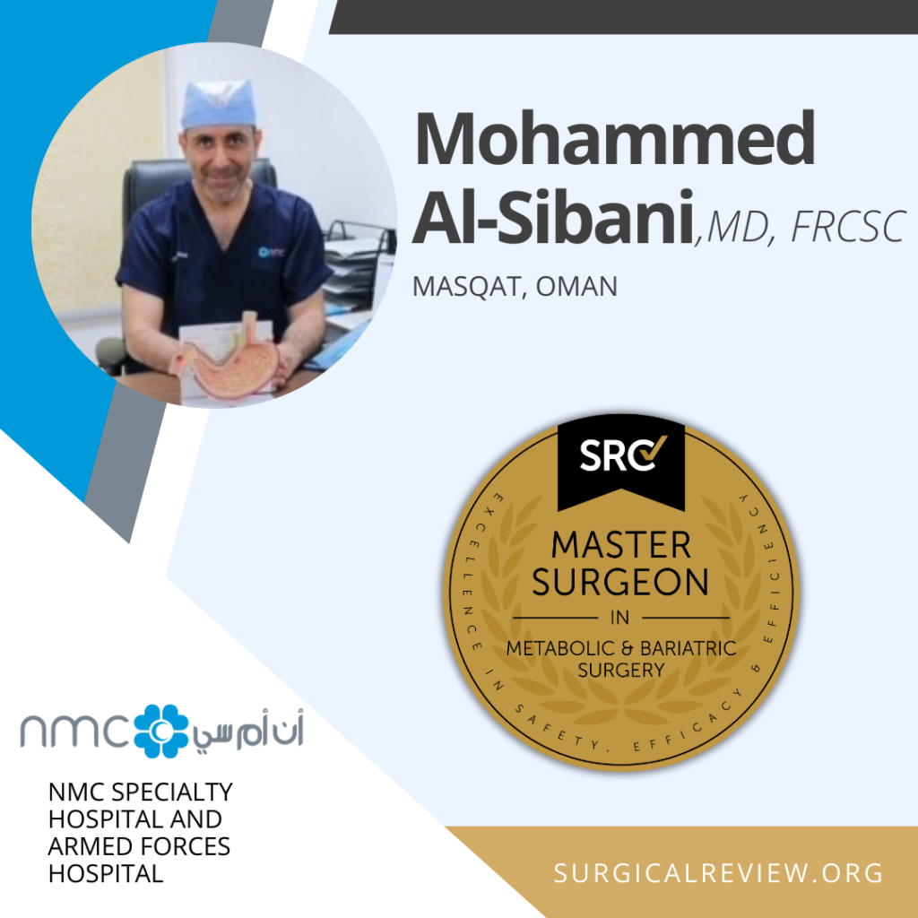Mohammed Al-Sibani, MD, FRCSC has been accredited as an SRC Master Surgeon in Metabolic and Bariatric Surgery. Dr. Al-Sibani practices at NMC Specialty Hospital and Armed Forces Hospital in Muscat, Sultanate of Oman.